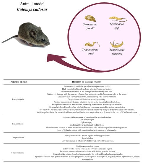 Studies with C. callosus showed that these animals are considered an adequate experimental model for investigating the dynamics of the acute phase and the acquired, ocular, and congenital forms of toxoplasmosis. Research has also shown that C. callosus is a tolerant natural host to Trypanosoma cruzi infection, in addition to being considered an alternative model in leishmaniasis studies since it can be naturally infected by Schistosoma mansoni [,,,,,,,].