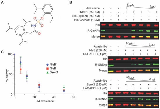 In vitro glycosylation assays were conducted as previously described [1]. Enzymes (200 nM of NleB1, NleB, or SseK1) were incubated in 50 mM Tris-HCl buffer pH 7.4, 1 mM UDP-GlcNAc, 10 mM MnCl2, and 1 mM DTT with 1 mM GAPDH in the presence or absence of serial dilutions of avasimibe. After a 2 h incubation at room temperature, samples were blotted with anti-R-GlcNAc and anti-His tag monoclonal antibodies (Abcam, Cambridge, MA, USA). LI-COR Image Studio software (LI-COR Biosciences, Lincoln, NY, USA) was used to measure signal intensities, and inhibition was estimated by measuring the relative reduction in substrate glycosylation.