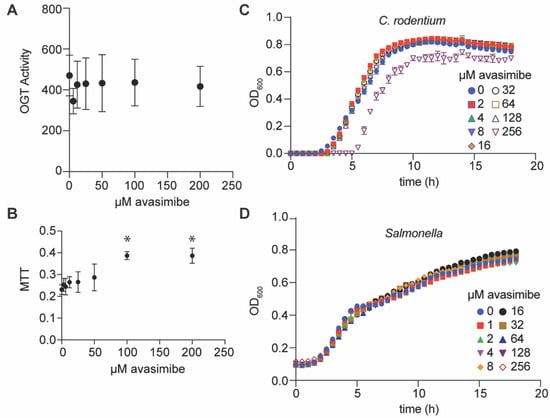 OGT activity, cytotoxicity, and bacterial growth assays. (A) OGT activity assay. OGT activity was measured by using a UDP-Glo assay in the presence of avasimibe, n = 3 independent experimental replicates. (B) Cell cytotoxicity as measured by performing 3-(4,5-dimethylthiazol-2-yl)-2,5-diphenyltetrazolium bromide (MTT) assays. Avasimibe was added to RAW264.7 cells for 24 h, and cell viability was assayed by monitoring MTT signal intensity, n = 3 independent experimental replicates. Asterisks (*) indicate significantly different MTT signals as compared to untreated cells, p < 0.05, Dunn’s multiple comparisons test. (C,D) Bacterial growth assays. C. rodentium and S. enterica were cultured in LB media at 37 °C in the presence of the indicated concentrations of avasimibe. Bacterial growth was monitored as a function of time, n = 3 independent experimental replicates.