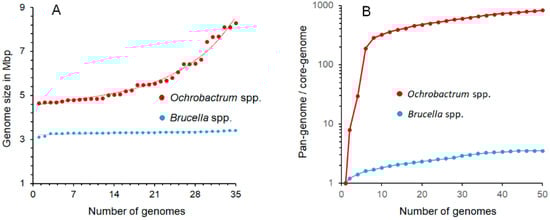 Comparisons of the genome and pangenome sizes of Ochrobactrum and Brucella organisms. (A) While the smaller Brucella genomes display a narrow range of sizes, the larger Ochrobactrum genomes show significant size variations across the genus; (B) the pronounced slope of the curve (shown in logarithmic scale) with a positive trend of Ochrobactrum pangenome/core genome ratio indicates a widely open pangenome, in which the complete gene repertoire cannot be predicted with confidence, since the diversity of strains with additional genes keeps increasing due to the continuous shuffling of genes across the species. In contrast, the shallow slope of the pangenome/core genome ratio curve strongly suggests a close pangenome with no further horizontal gene exchange in the extant Brucella species. The prediction is that as more Brucella genomes are included, the numbers of conserved and accessory genes would remain, with just a limited number of additions and a proportion of ~3.6 unique-accessory genes per core conserved gene. Accordingly, the overall Brucella coding genome repertoire of the Brucella pangenome can be predicted, with some accuracy, in ~11,000 genes. Data to construct the graphs were retrieved from [,,,,].
