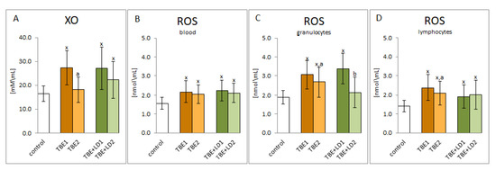 The effect of TBEV infection (TBE1) and TBEV+Bb/Ap co-infection (TBE+LD1) as well as therapy (TBE2 and TBE+LD2) on the pro-oxidative response of the patient’s organism, visible in the activity of plasma xanthine oxidase (XO) (A) as well as in the level of ROS assessed in plasma (B), granulocytes (C) and lymphocytes (D) compared to healthy subjects (control). The mean values for TBE patients (before–TBE1 and after treatment–TBE2, n = 40), patients with TBE+LD (before–TBE+LD1 and after treatment–TBE+LD2, n = 6) and control subjects (n = 20) with SD are shown as follows: x—differences vs. control group, p < 0.05; a—differences vs. TBE1 group, p < 0.05; b—differences vs. TBE+LD1 group, p < 0.05.