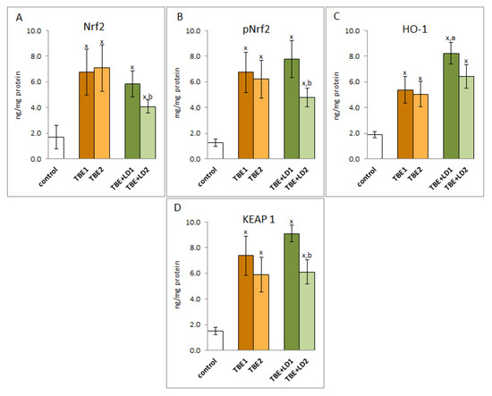 The effect of TBEV infection (TBE1) and TBEV+Bb/Ap co-infection (TBE+LD1) as well as therapy (TBE2 and TBE+LD2) on the effectiveness of the Nrf2 (A) transcription factor, visible in the expression of Nrf2/pNrf2 (B), HO-1 (C) and KEAP1 (D) assessed in granulocytes of patients and compared to healthy subjects (control). The mean values for TBE patients (before–TBE1 and after treatment–TBE2, n = 40), patients with TBE+LD (before–TBE+LD1 and after treatment–TBE+LD2, n = 6) and control subjects (n = 20) with SD are shown as follows: x—differences vs. control group, p < 0.05; a—differences vs. TBE1 group, p < 0.05; b—differences vs. TBE+LD1 group, p < 0.05.