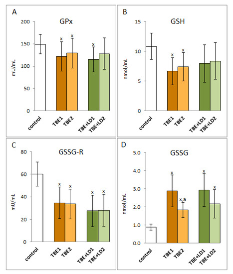The effect of TBEV infection (TBE1) and TBEV+Bb/Ap co-infection (TBE+LD/HGA1) as well as therapy (TBE2 and TBE+LD2) on the glutathione system of the patient’s organism response, visible in the activity of plasma glutathione peroxidase (GPx) (A), level of GSH (B) and activity of glutathione reductase (GSSG-R) (C) as well as in the level of GSSG (D) assessed in plasma compared to healthy subjects (control). The mean values for TBE patients (before–TBE1 and after treatment–TBE2, n = 40), patients with TBE+LD (before–TBE+LD1 and after treatment–TBE+LD2, n = 6) and control subjects (n = 20) with SD are shown as follows: x—differences vs. control group, p < 0.05; a—differences vs. TBE1 group, p < 0.05.