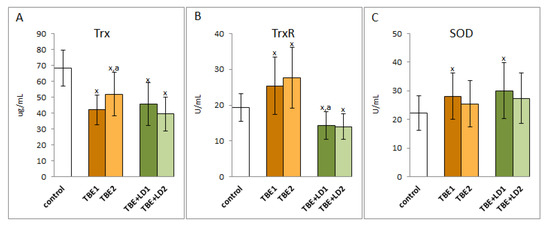 The effect of TBEV infection (TBE1) and TBEV+Bb/Ap co-infection (TBE+LD1) as well as therapy (TBE2 and TBE+LD2) on the thioredoxin system including thioredoxin (Trx) (A) and thioredoxin reductase (TrxR) (B) as well as superoxide dismutase (SOD) (C) in plasma of patients compared to healthy subjects (control). The mean values for TBE patients (before–TBE1 and after treatment–TBE2, n = 40), patients with TBE+LD (before–TBE+LD1 and after treatment–TBE+LD2, n = 6) and control subjects (n = 20) with SD are shown as follows: x—differences vs. control group, p < 0.05; a—differences vs. TBE1 group, p < 0.05.