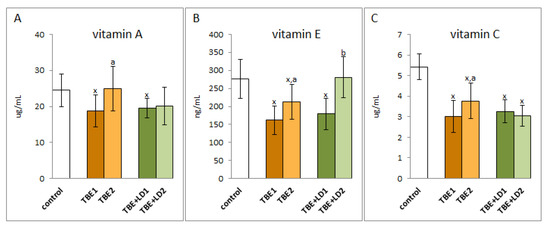 The effect of TBEV infection (TBE1) and TBEV+Bb/Ap co-infection (TBE+LD1) as well as therapy (TBE2 and TBE+LD2) on the vitamins A (A), E (B) and C (C) in plasma of patients compared to healthy subjects (control). The mean values for TBE patients (before–TBE1 and after treatment–TBE2, n = 40), patients with TBE+LD (before–TBE+LD1 and after treatment–TBE+LD2, n = 6) and control subjects (n = 20) with SD are shown as follows: x—differences vs. control group, p < 0.05; a—differences vs. TBE1 group, p < 0.05; b—differences vs. TBE+LD1 group, p < 0.05.