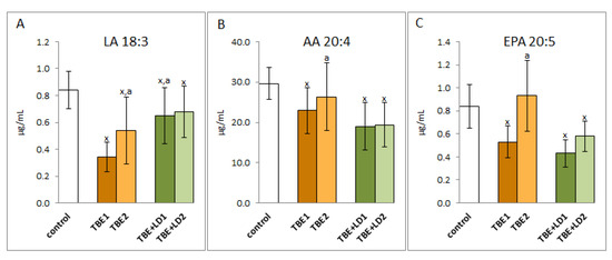 The effect of TBEV infection (TBE1) and TBEV+Bb/Ap co-infection (TBE+LD1) as well as therapy (TBE2 and TBE+LD2) on the lipid polyunsaturated fatty acids (PUFAs), visible in the level of linoleic acid (LA) (A), arachidonic acid (AA) (B), and eicosapentaenoic acid (EPA) (C) assessed in plasma of patients compared to healthy subjects (control). The mean values for TBE patients (before–TBE1 and after treatment–TBE2, n = 40), patients with TBE+LD (before–TBE+LD1 and after treatment–TBE+LD2, n = 6) and control subjects (n = 20) with SD are shown as follows: x—differences vs. control group, p < 0.05; a—differences vs. TBE1 group, p < 0.05.