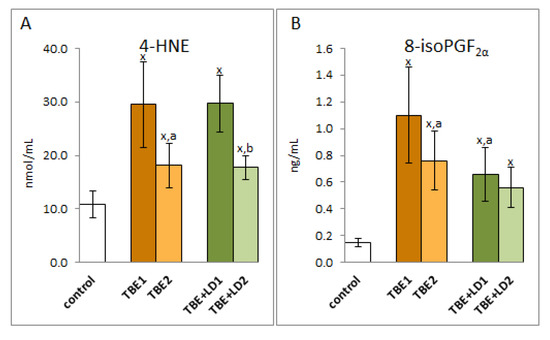 The effect of TBEV infection (TBE1) and TBEV+Bb/Ap co-infection (TBE+LD1) as well as therapy (TBE2 and TBE+LD2) on the lipid peroxidation products visible in the level of 4-HNE (A) and 8-isoPGF2α (B) assessed in plasma of patients compared to healthy subjects (control). The mean values for TBE patients (before–TBE1 and after treatment–TBE2, n = 40), patients with TBE+LD (before–TBE+LD1 and after treatment–TBE+LD2, n = 6) and control subjects (n = 20) with SD are shown as follows: x—differences vs. control group, p < 0.05; a—differences vs. TBE1 group, p < 0.05; b—differences vs. TBE+LD1 group, p < 0.05.