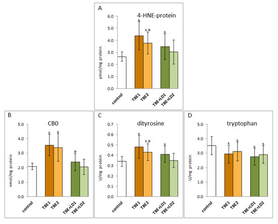 The effect of TBEV infection (TBE1) and TBEV+Bb/Ap co-infection (TBE+LD1) as well as therapy (TBE2 and TBE+LD2) on the protein structure modifications, visible as the levels of 4-HNE-protein adducts (A), protein carbonylated groups (CBD) (B), protein dityrosine (C), and tryptophan (D) assessed in plasma of patients compared to healthy subjects (control). The mean values for TBE patients (before–TBE1 and after treatment–TBE2, n = 40), patients with TBE+LD (before–TBE+LD1 and after treatment–TBE+LD2, n = 6) and control subjects (n = 20) with SD are shown as follows: x—differences vs. control group, p < 0.05; a—differences vs. TBE1 group, p < 0.05.