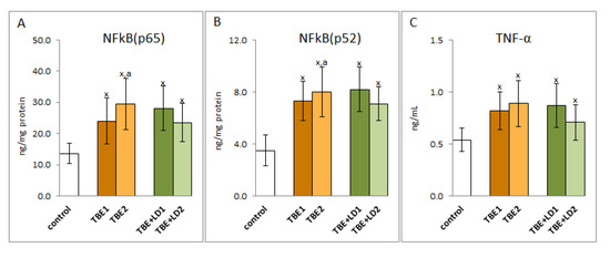 The effect of TBEV infection (TBE1) and TBEV+Bb/Ap co-infection (TBE+LD1) as well as therapy (TBE2 and TBE+LD2) on the effectiveness of the NFkB transcription factor, visible in the expression of subunits NFkB (p65 (A) and p52 (B)) assessed in granulocytes and product its activity—TNFα (C) measured in plasma of patients and compared with healthy subjects (control). The mean values for TBE patients (before–TBE1 and after treatment–TBE2, n = 40), patients with TBE+LD (before–TBE+LD1 and after treatment–TBE+LD2, n = 6) and control subjects (n = 20) with SD are shown as follows: x—differences vs. control group, p < 0.05; a—differences vs. TBE1 group, p < 0.05.