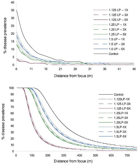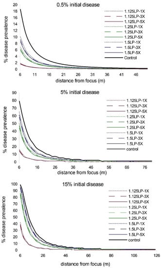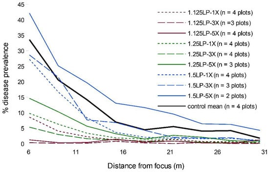 Mean disease gradients of experimentally initiated WSR field epidemics with all pairwise combinations of 1.125 (red), 1.25 (green), 1.5 (blue) latent periods (LP) and 1× (dotted), 3× (hashed), and 5× (solid) focus width ring cull sizes, and untreated control epidemics.