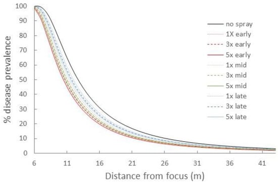 Empirical and in silico studies suggest that the outbreak region itself should have a strong influence on the subsequent epidemic magnitude [5,29,30,48,52]. Early treatments may be more effective at suppressing epidemic spread because they can delay disease build-up and reduce the incidence of long-distance dispersal events that accrue with an increase in local disease levels [37,39,48]. Although WSR epidemics were marginally suppressed in two of the 1.125 LP-1× field plots (Figure S3), overall, the 1.125 LP treatments reduced disease levels to a degree that the disease gradient characteristic of an epidemic was not observed (Figure 1; compare 1.125 LP with control gradients). Assuming that the simulations sufficiently approximated experimental field conditions, it is likely that the 1.125 LP treatments suppressed disease because only a relatively small number of the effective spores had been produced and dispersed from the focus by the treatment time. The spore production curve used in our simulations suggested that only ~10% of the total number of estimated spores (for the second latent period) would have been produced by the 1.125 LP treatment timing (Figure S1). With progressively delayed treatments, a greater proportion of spores were likely released from the focus. At 1.25 LP, we estimated about 35% of the estimated spores had been produced, but by 1.5 LP, ~85% had already been produced and presumably dispersed. Ostensibly, the 1.5 LP treatment seems relatively early in the disease cycle. However, by this time the majority of spores were likely released, ultimately generating disease curves that were more similar to those produced by untreated outbreaks (Figure 1 and Figure 2). We did not measure spore production and lesion development in the field, but the qualitative ranking of end epidemic disease levels coincided with what would be expected based on the amount of spores produced at each latent period treatment. The earliest (1.125 LP) treatments had the greatest effect on disease suppression, and the 1.25 LP treatments were intermediate to the earliest and latest (1.5 LP treatments), which did not statistically differ from untreated epidemics. In a manner analogous to invasion potential from introductions/outbreaks with smaller numbers of colonizing propagules [37,39,53], earlier treatment timing is likely to limit the distance and frequency that a disease can be dispersed from the outbreak.