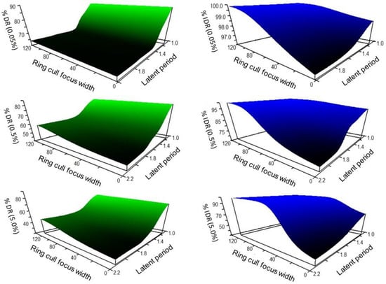 The response landscape projected through non-parametric multiplicative regression (NPMR) of WSR disease spread simulations, taking into account disease levels inside and outside of the treatment area (inclusive disease reduction, IDR), suggested a potential compensation for a delay in treatment by an increase in ring cull area. The interpolated response landscape over all initial disease levels (0.05%, 0.5%, 5.0%) consistently projected a large suppressive effect of the earliest treatments (1.125 LP), which became incrementally more effective at reducing disease as ring cull size increased (Figure 6, blue landscapes). There was a plateau of relatively large suppressive effects associated with the larger ring cull sizes (>80 focus widths) and earlier timings (<1.35 LP), with a steep gradient of progressively less effective disease reduction converging on late timing (2.0 LP) and small ring cull size (1× focus width) (Figure 6, blue landscapes). In terms of inclusive disease reduction, our simulations suggest that delayed treatments could be offset by a larger ring cull area. However, this compensation occurred because of host death (removal) within the larger ring cull areas.