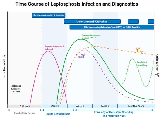 Kinetics of leptospiral infection and corresponding diagnostic tools. Infection with Leptospira spp. results in leptospiremia 2–20 days after exposure and leptospiruria approximately one week later. In some hosts, persistent infection of the renal tubules leads to persistent or waxing and waning urinary shedding or organisms. Leptospira antibodies are produced after 1 week of infection and can persist for months to years. Bacterial culture or molecular detection of leptospiral DNA can be utilized when bacteria are likely to be present in the collected specimen depending on the course of disease. Antibody detection assays, including the microscopic agglutination test, are often negative in the first week of infection; therefore, paired sera collected during the acute phase and 1–2 weeks later are recommended. Adapted from “Time Course of COVID-19 Infection and Test Positivity”, by BioRender.com (2021). Retrieved from https://app.biorender.com/biorender-templates (accessed 11 April 2021).