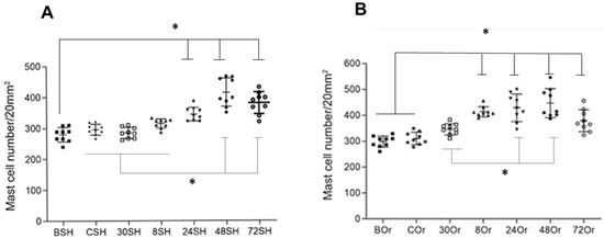 Mast-cell (MC) numbers from pinna skin samples of sham (SH) and orchiectomized (Or) mice after intradermal inoculation of L. mexicana with salivary gland lysates. Toluidine blue-stained MCs counted in 20 mm2 of tissue sections f rom (A) sham-operated and (B) orchiectomized mice. In sham-operated mice (A,*), a significantly lower number of MCs were found in tissues in basal conditions (BSH), as compared to at 24, 48, and 72 h postinfection (24SH, 48SH, 72SH). CSH, 30SH and 8SH were significantly lower as compared to 24SH and 48SH. In orchiectomized mice (B,*), significantly lower numbers of MCs were found in basal and control conditions (BOr and Cor), as compared to 8, 24, 48 and 72 h post infection (8Or, 24Or, 48Or and 72OR). At 30 min (30Or) post infection, the MC numbers were significantly lower as compared to 24 and 48 h (24Or, 48Or) in orchiectomized animals. Nonparametric ANOVA ordinary multiple comparisons was employed (Significance p < 0.0001). (Abbreviations: BSH: basal sham; CSH: control sham; 30SH: 30 min sham; 8SH: 8 h sham; 24SH: 24 h sham, 48SH: 48 h sham; 72SH: 72 h sham. BOr (basal orchiectomized; COr control orchiectomized; 30Or: 30 min orchiectomized, 8–72 Or: 8–72 h orchiectomized). Three independent experiments with five replicates for each group.* p ˂ 0.001.