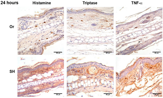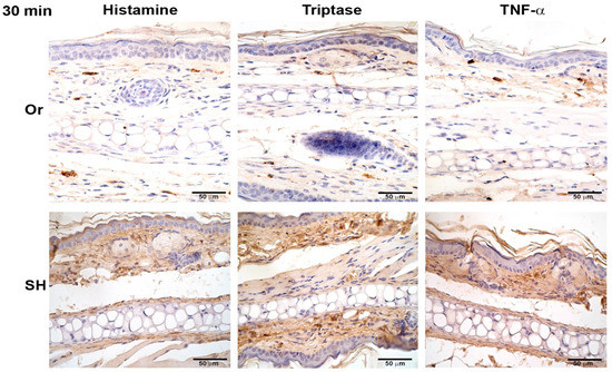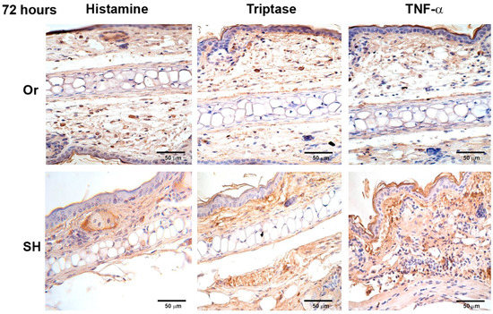 Comparative immunohistochemical assessment of histamine, tryptase, and TNF-α release in pinna skin mast cells (MCs) from sham (SH) and orchiectomized (Or) BALB/c mice, at 30 min in response to the dermal inoculation of L. mexicana, combined with salivary gland lysate. The immunoreactivity of inflammatory factors in MCs was more intense in Or mice than in SH mice. However, a diffuse and intense interstitial mark was observed only in SH mice. Images representative of three independent experiments with five replicates for each group.