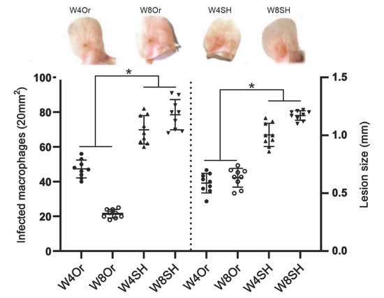 Comparative sizes of pinna skin ulcered nodules at 4 and 8 weeks (W) after L. mexicana promastigote infections, including counts of infected macrophages. Orchiectomized mice (Or) produced smaller lesions as compared to sham-operated (SH) mice. Lower numbers of infected macrophages were evidenced in Or mice (42.8 ± 0.2 and 21.6 ± 0.4/20 mm2) and smaller lesions (0.58 ± 0.084 mm and 0.62 ± 0.074 mm) after 4 or 8 weeks, respectively, as compared to SH mice (71.2 ± 0.3 and 79.8 ± 0.2/20 mm2) and (1 ± 0.1 mm and 1.1 ± 0.04 mm), at the same time points. Orchiectomized mice showed strict control of parasitic infection at 8 weeks. Images representative of three independent experiments with five replicates for each group. Significant differences (*) between SH mice and Or mice (p ≤ 0.03).