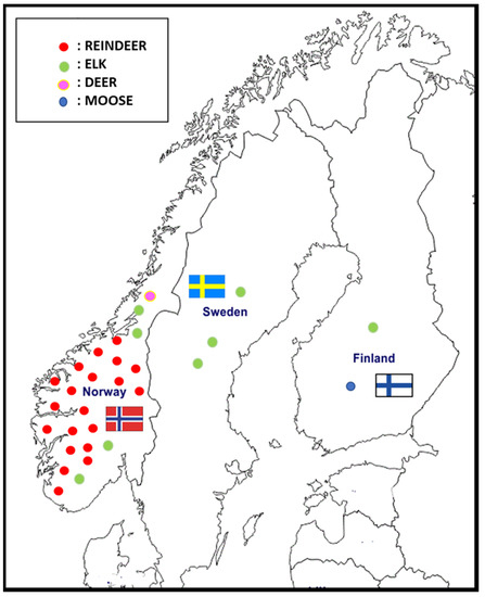 The first case of CWD in Europe was reported in a free-ranging reindeer (Rangifer tarandus) in Nordfjella, Norway, in March 2016 [3]. Since then, 29 cases of CWD have been identified in Norway: 20 reindeer (Rangifer tarandus), 8 moose (Alces alces), and 1 red deer (Cervus elaphus). One of the main problems is having to manage a potential epidemic in a reindeer population characterized by high density and promiscuity between semidomestic and wild animals. Two cases of CWD have been reported in Finland since March 2018, and three cases were reported in Sweden since March 2019 [4] (Figure 1).