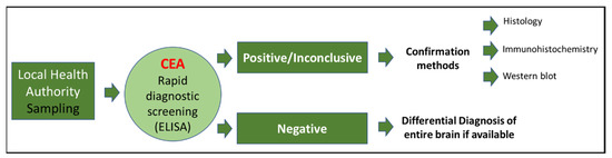 In the framework of surveillance, the sampling of the brainstem (obex), medial retropharyngeal lymph nodes, and, whenever possible, the brain and tonsils of wild and farmed cervids found dead or emaciated is carried out by a local health authority. The samples are sent to the local Istituto Zooprofilattico (Public Health Institute) and then to the CEA laboratory, which is a part of the Istituto Zooprofilattico Sperimentale del Piemonte, Liguria e Valle d’Aosta (IZSPLV), where the samples undergo rapid diagnostic screening tests. Positive or inconclusive samples undergo histological, immunohistochemical (IHC), and immunobiochemical (Western blot) confirmation (Figure 2).