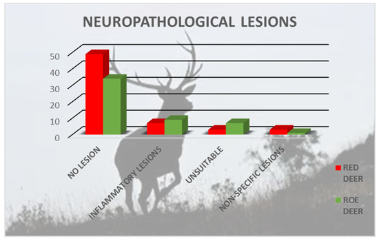 Neuropathological analysis of brain samples from 62 red deer and 51 roe deer.