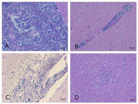 Listeria spp. neuropathological lesions are typically a mixture of non-suppurative and suppurative patterns [13,14]; therefore, they were included among the differential diagnoses in this study. Another etiologic agent attributable occasionally to suppurative brain injuries described in the literature was Brucella spp. [15]. Unfortunately, with respect to the one specimen with suppurative lesions, there were no tissues available that were either frozen or paraffin-embedded; thus, it could not be investigated.