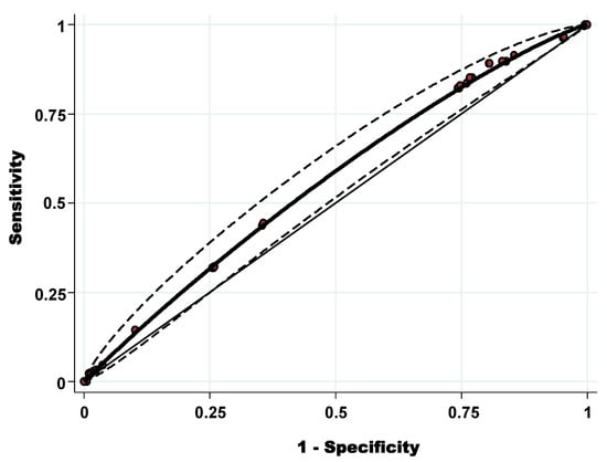 The diagnostic discriminatory power was assessed by calculating the AUC-ROC (Figure 2). The AUC-ROC was 0.56 (95% CI: 0.52–0.60) with standard error = 0.021. Using both the Youden index (0.087) the best cut-off to discriminate the level of tick infestation (high and low level) was OWS = 3.34. Applying this cut-off, the sensitivity was 89.14%, and the specificity was 19.54%.