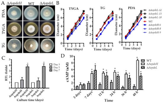 Three independent knockout strains for AopdeH (ΔAopdeH) and AopdeL (ΔAopdeL) were respectively confirmed (Supplementary Figure S2) and used for phenotypic analysis. The growth rate and colony morphology of the WT and mutant strains were compared on different media. As a result, it was found that the ΔAopdeH mutants showed growth defects on the three media at 28 °C for five days post-induction (dpi), showing a significant defect in radial growth and reduction in aerial hyphae growth compared to the WT strain (Figure 1A,B). However, the mycelial growth of the ΔAopdeL mutant was similar to the WT strain. The number of hyphal septa had no significant difference between the WT and mutants, whereas partial hyphal cells of the ΔAopdeH and ΔAopdeL mutants became swollen (Supplementary Figure S3). Moreover, the transcriptional levels of AopdeH and AopdeL in the WT strain were determined, and their expression increased with the extension of culture times; the expression of AopdeH and AopdeL were increased by 3.8-fold at 7 dpi compared to that at 3 dpi (Figure 1C).
