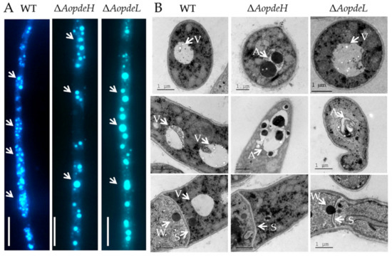 The autophagic process in the WT and mutants was observed by staining with monodansylcadaverine (MDC) dye; many autophagosomes could be seen in the WT, which distribute in hyphal cells in a punctate pattern. In contrast, the number of autophagosomes was decreased in the hyphal cells of the ΔAopdeH and ΔAopdeL mutants, whereas the volume of autophagosomes in mutants became remarkably enlarged (Figure 2A). In addition, the cellular ultrastructures of the WT and mutants were observed using transmission electron microscopy (TEM; Hitachi, Tokyo, Japan). The vacuole was observed in the hyphal cells of the WT strain, and woronin body could be seen near the septum; similar to the WT, vacuole and woronin body were observed in the hyphal cells of the ΔAopdeL mutant, as well autophagosome-like structure could also be observed. In contrast, less woronin body was observed in the hyphal cells of the ΔAopdeH mutant, and more autophagosome-like structures were observed in the ΔAopdeH mutant (Figure 2B).