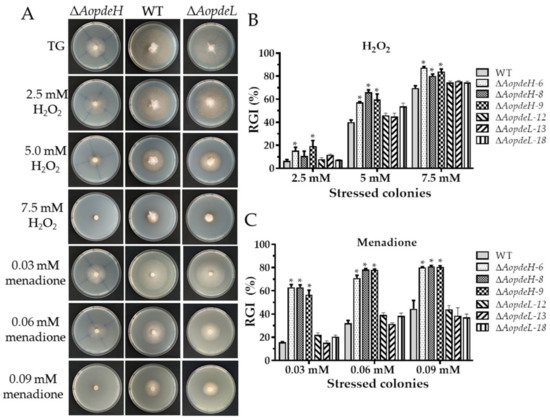 The WT and mutant stress response was compared against cell wall stress agents, oxidative and osmotic stresses to investigate the effects of PDEs on environmental stresses. The radial mycelial growth of the ΔAopdeH mutants was considerably inhibited by these stressors (Figure 4, Figures S4 and S5). The relative growth inhibition (RGI) value was calculated considering the influence of the growth defects of the mutant strain. Compared with the WT, The AopdeH mutants had a higher RGI value at H2O2 (2.5, 5.0, and 7.5 mM), menadione (0.03, 0.06, and 0.09 mM), sorbitol (0.25, 0.5, and 0.75 M), NaCl (0.2 M), SDS (0.35 and 0.52 mM), and Congo red (0.05 mM). In contrast, the AopdeL-deficient strain showed a WT phenotype to oxidants (H2O2 and menadione) (Figure 4), and it had a higher RGI value at 0.1 M NaCl (Supplementary Figure S4). Nevertheless, the radial growth of the ΔAopdeL mutants was promoted at 0.08–0.12 mg/mL Congo red (Supplementary Figure S5).