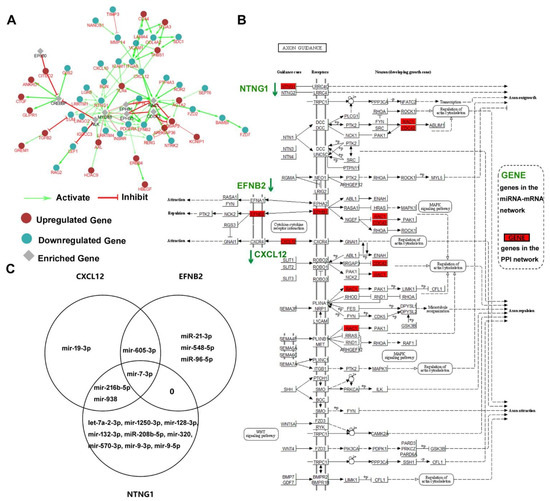 - The axon guidance pathway (hsa04360), three genes (NTNG1, EFNB2, and CXCL12) and 17 miRNAs were highlighted participating in HAND progression.