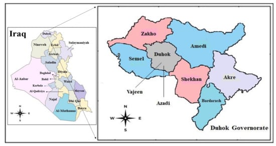 Map of the studied area with Azadi and Vajeen reference Hospitals in Duhok city, Duhok governorate, Kurdistan region, Iraq (from Wikivoiage, 2019).