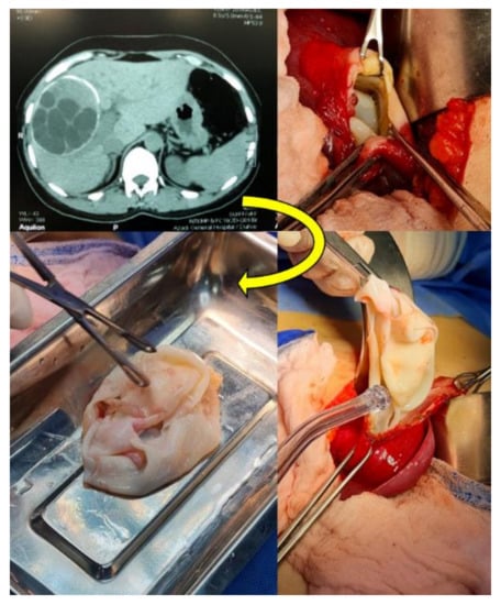 Computed tomography (CT) and the open surgery procedure for the excision of Echinococcus granulosus sensu lato cysts (CE3b stage) from a human liver in Duhok city, Duhok governatorate, Kurdistan region, Iraq.