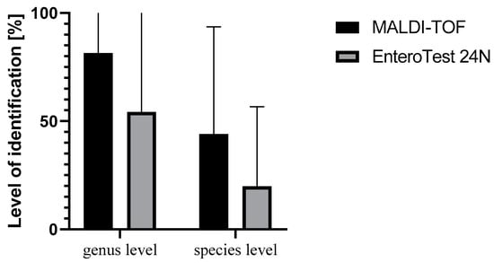 Our research has shown that 80% of the reference strains were correctly identified to the species level and 100% to the genus level using the EnteroTest 24N test, while for MALDI-TOF, the accuracy was 100%. In the case of environmental strains, identification using the MALDI-TOF technique was much more effective than EnteroTest 24N tests and reached 70.97% of correctly identified strains, compared to 41.97% obtained by EnteroTest 24N.