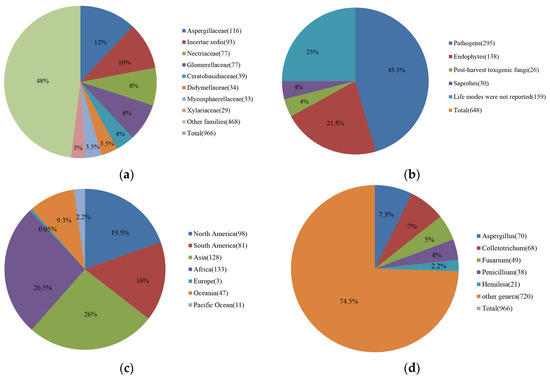 (a) Percentages of different fungal families reported on coffee; (b) Percentages of different life modes of fungi reported on coffee; (c) Percentages of coffee pathogens reported in different countries; (d) Percentages of most frequently reported fungal pathogenic and toxigenic fungal genera on coffee.