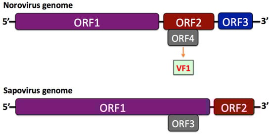 The caliciviruses are non-enveloped, single-stranded, positive-sense RNA viruses, approximately 7.3–8.5 kb in size. Based on their genome structure, the Caliciviridae family can be further differentiated into two groups [9]. In the first, including the Norovirus, the open reading frame 1 (ORF1) is separated from ORF2 and ORF3 near the 3′ end, while an ORF4 (comprised within ORF2) encodes the virulence factor, VF1 (Figure 1). In the second group, containing the Sapovirus, there is a large ORF1 and a standard ORF2 (equivalent to ORF3 of the Norovirus), whereas an ORF3, equivalent for ORF4 was suggested (Figure 1).