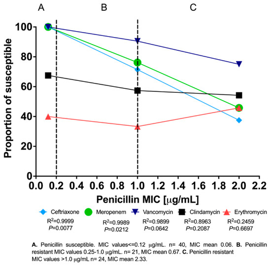 Penicillin susceptibility, as determined by minimum inhibitory concentration (MIC) values, was compared to susceptibility to ceftriaxone, meropenem, vancomycin, clindamycin, and erythromycin. Penicillin resistance was often observed alongside resistance to ceftriaxone (24.7%), meropenem (21.2%), clindamycin or erythromycin (18.8%), and vancomycin (9.4%). More specifically, penicillin susceptibility was highly correlated with susceptibility to ceftriaxone (R2 = 0.9999, p = 0.0077), meropenem (R2 = 0.9989, p = 0.0212), and vancomycin (R2 = 0.9899, p = 0.0642) (Figure 2). Where penicillin resistance was high (i.e., MIC > 1), we observed high resistance to meropenem and ceftriaxone. Clindamycin susceptibility declined slightly with increased penicillin MIC (R2 = 0.8963, p = 0.2087), but the trend plateaued and was not statistically significant. Erythromycin resistance did not show a clear pattern with respect to penicillin resistance (Figure 2).