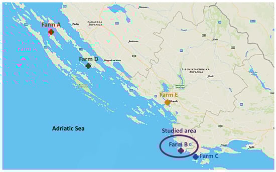 Map of Middle Eastern Adriatic Sea with farms included in the study.