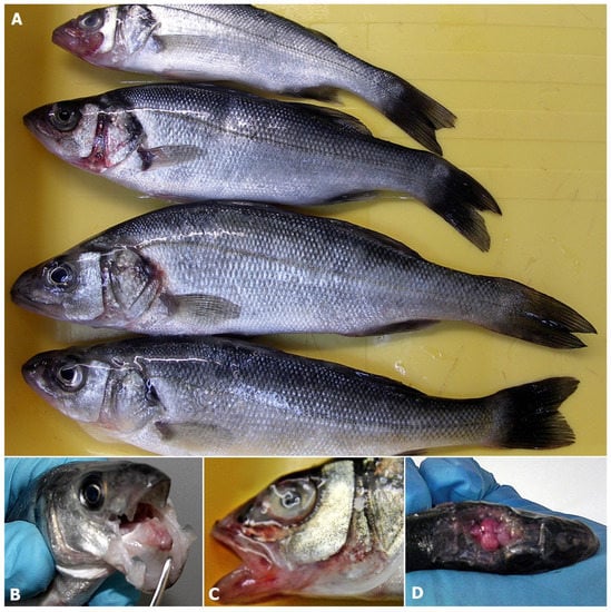 In the case of farm B, although the presence of the virus was detected in mid-June without any clinical signs, the onset of typical symptoms (Figure 2A,B,D) and increased mortalities started at the end of July jointly with the growth of sea temperature to 23 °C.
