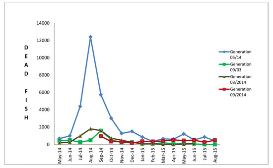 At the same time, the mortality rate increased drastically in the case of the batch imported into the farm in May 2014 (Figure 3). Mortality rate increased also in other infected generations including ESB fry introduced in the farm in March 2014 and almost year-old ESB introduced in farm B in September 2013. Affected fish displayed loss of appetite, dark pigmentation of the skin, abnormal swimming behaviour such as spiral swimming followed by long periods of lethargy, hyper-reactivity after stimuli, atypical vertical position in the water column and traumatic lesions on the jaws, head, eyes and nose (Figure 2A,B). The symptoms were most pronounced in the batch introduced into farm B in May 2014. Necropsy revealed an empty digestive tract, haemorrhages and hyperemia of the brain. Similar changes were reported in farms C, D and E, and in addition, extensive haemorrhages and necrosis on the head, mouth, opercula, around the mouth, in the mouth and congestion and hyperemia of the brain were also observed.