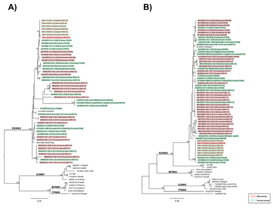 ML phylogenetic trees of Croatian Betanodavirus strains based on complete RNA1 (A) and RNA2 (B) sequences. The phylogenies included betanodaviruses derived from Mediterranean wild and farmed fish from 2008 to 2014. For each strain information regarding species, country and year of isolation are reported within brackets. Croatian sea bass and thicklip grey mullet betanodaviruses under investigation are highlighted in red. Strains isolated from wild fish are labelled in pink, while betanodaviruses detected in farmed fish are labelled in green. The genotype subdivision according to Nishizawa et al. (1997) is shown at the main branches. The numbers at the nodes represent bootstrap values (only values ≥ 70% are reported), while branch lengths are scaled according to the number of nucleotide substitutions per site. The trees are midpoint rooted for clarity only. The scale bars are reported.