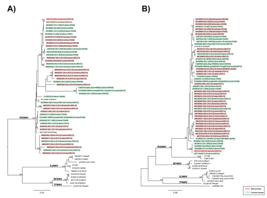 - Nishizawa, T.; Furuhashi, M.; Nagai, T.; Nakai, T.; Muroga, K. Genomic classification of fish nodaviruses by molecular phylogenetic analysis of the coat protein gene. Appl. Environ. Microbiol. 1997, 63, 1633–1636. [Google Scholar] [CrossRef] [Green Version]