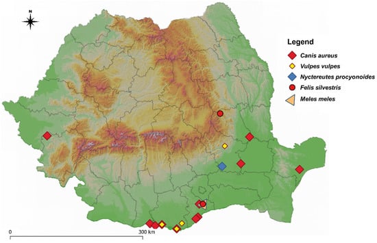 The present study represents an extension of previous work [,], and provides data obtained during further monitoring of heartworm infection in the Romanian wildlife. Most positive animals originated from the southern and south-eastern part of the country, where endemicity in domestic dogs’ populations has been repeatedly confirmed and the prevalence of infection was up to 26% [,].