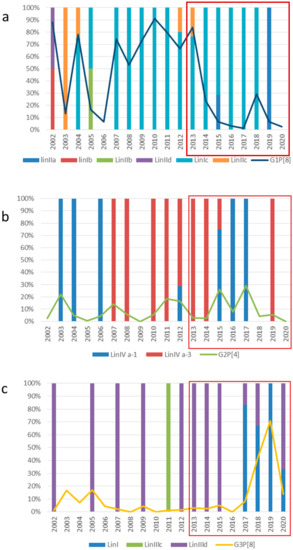 Temporal distribution over the study period of VP7 lineages and sublineages of Rotavirus G1P[8] (a), G2P[4] (b), G3P[8] (c), and G12P[8] (d). Overlaid lines show the prevalence rate of each genotype and the post-vaccine period (2013–2020) is highlighted in the box. * The G12 RV was detect in association with P[8] or P[14] genotype.