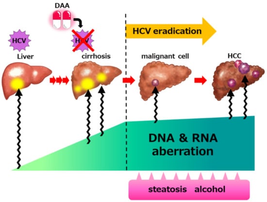 Accumulated genetic alterations in hepatitis C virus (HCV)-infected liver contributes to hepatocarcinogenesis even after HCV eradication. Persistent HCV infection and associated chronic inflammation results in the stepwise accumulation of genetic and epigenetic aberrations. Although achieving sustained viral response (SVR) with direct-acting antiviral (DAA) treatment suppresses the progression of liver fibrosis and carcinogenesis, accumulated genetic aberrations may lead to hepatocellular carcinoma (HCC) development after HCV eradication. In addition, liver fat accumulation, impaired glucose tolerance, and alcohol consumption may accelerate carcinogenesis.