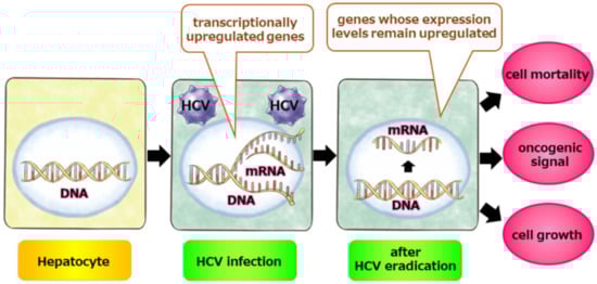 Irreversible transcription profiles even after HCV eradication. A subset of transcriptional changes caused by HCV infection can remain in hepatocytes even after HCV eradication. Such transcriptional alterations may contribute to enhanced cell proliferation, promotion of apoptosis, and dysregulation of intracellular signaling.