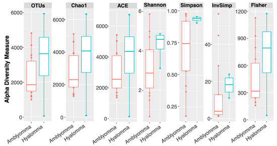 Alpha diversity analysis. Boxplots show Shannon, Simpson, Inv Simpson, Fisher diversity, observed OTUs, Chao1, and ACE indices. The diversity indices Shannon, Simpson, Inv Simpson, Fisher results showed significant differences between Amblyomma (A. variegatum and A. hebraeum) and Hyalomma (H. truncatum) (pairwise Wilcoxon rank-sum test, p = 0.021), but the richness indices, observed OTUs, Chao1, and ACE showed no significant differences after multiple testing corrections (Kruskal–Wallis, FDR > 0.05).