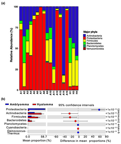 At the phylum level, classified sequence reads revealed four major phyla: Actinobacteria (34.65%), Proteobacteria (31.41%), Firmicutes (23.40%), and Bacteroidetes (9.37%), with the remaining phyla accounting for <1.15% of total abundance (Figure 3a). However, members of phylum Proteobacteria were relatively abundant in Amblyomma, while Actinobacteria, Bacteroidetes, and Firmicutes were dominant taxa in Hyalomma tick species. To further delineate the differences in bacterial community composition and structure, a two-sided t-test statistical analysis coupled with multiple test correction Storey FDR (false discovery rate) at a 95% confidence interval was performed. An extended error plot (Figure 3b) revealed significant differences (q-value < 0.0001) in mean proportions in Amblyomma and Hyalomma bacterial communities at the phylum level. Members of phylum Proteobacteria were significantly enriched in Amblyomma ticks, whereas Firmicutes, Bacteroidetes, and Actinobacteria were the significant taxa in Hyalomma ticks.