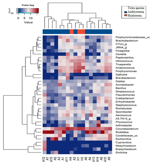 Heatmap showing top 35 bacterial species identified based on using EzBioCloud 16S Database (www.ezbiocloud.net, accessed on 28 February 2022) [45]. Dendrogram heatmap based on similarity and distribution of bacteria communities in Hyalomma and Amblyomma tick species at the species level. Dendrogram linkages and distance of the bacterial genus are not phylogenetic but based upon the relative abundance of species within individual tick samples. The y-axis represents abundance while the x-axis represents the individual tick samples.
