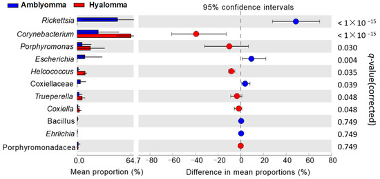 As ticks are known to be the most important vectors of pathogens [1,2], this study also examined the distribution of potentially pathogenic bacterial taxa associated with two tick species. Potential Pathogenic genera in the top 40 abundant OTUs identified included Rickettsia, Ehrlichia, Coxiella, Porphyromonas, Trueperella, Corynebacterium, and Helcococcus. Interestingly, these taxa, with exception of genus Ehrlichia and Bacillus, constituted the metagenomic biomarkers detected by LEfSe analysis (Figure 5b,c). We then performed the two-sided White’s non-parametric t-test to identify differences in the pathogenic microbiome between Amblyomma and Hyalomma ticks. Consistent with LEfSe results, potentially pathogenic genus Rickettsia was exclusive and highly (q-value < 0.0001) abundant (accounting for 36.7% of sequence reads) in Amblyomma tick samples (Figure 6). Other differentially abundant (White’s non-parametric test, p < 0.05) potentially pathogenic genera in both A. variegatum and A. hebraeum included unclassified Coxiellaceae and Escherichia. In contrast, Porphyromonas, Trueperella, Corynebacterium, Coxiella, and Helcococcus were highly enriched (q-value < 0.0001) in H. truncatum ticks.