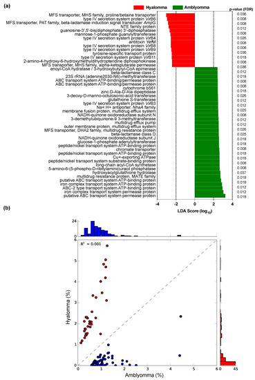 Differentially abundant KEGG orthologs related to drug resistance and pathogenesis biomarkers in Amblyomma (A. variegatum and A. hebraeum) and Hyalomma (H. truncatum) tick microbiomes. (a) LEfSe histogram of the differential drug resistance and pathogenesis biomarkers at a logarithmic LDA score > 2. The p-values (adjusted by Benjamini–Hochberg correction to account for false discovery rates) are shown. (b) Scatter plot showing clustering of the biomarkers of bacteria in the two tick species. The plot used a two-sided, White’s non-parametric t-test at 95% confidence interval with the DP bootstrap method.