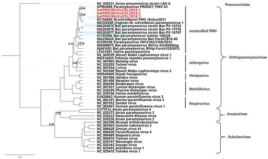 - Larsen, B.B.; Gryseels, S.; Otto, H.W.; Worobey, M. Evolution and Diversity of Bat and Rodent Paramyxoviruses from North America. J. Virol. 2021, 96, JVI-01098. [Google Scholar] [CrossRef] [PubMed]